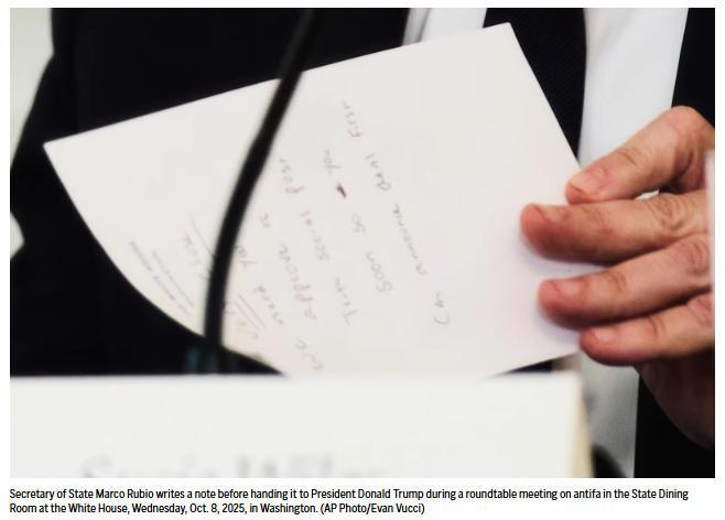 中新网10月9日电 据美联社报道,当地时间8日,美国总统特朗普在举行一场圆桌会议时配资公司官方网,国务卿鲁比奥向特朗普递上了一张纸条。